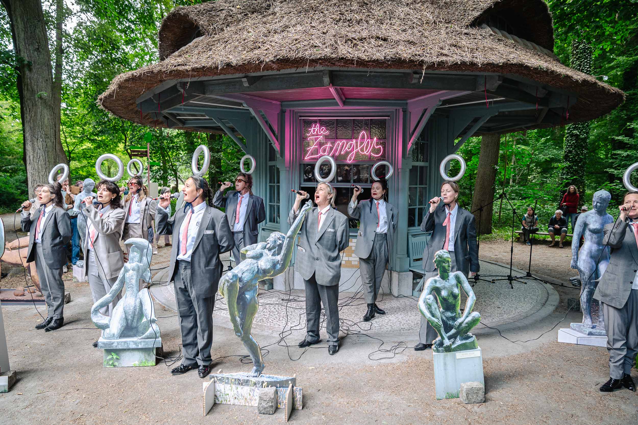 Voor de 75ste verjaardag van het Middelheimmuseum ontwikkelden The Zangles een bijzondere constellatie van performances en merchandise. In een onnavolgbare mix van ironie, milde institutionele spot en empowerment kregen negen moderne sculpturen uit de Middelheimcollectie een krachtig support system. In gesprek met directeur Sara Weyns vertellen The Zangles over de kracht van samenzang en vragen zich af hoe merchandising een betekenisvolle kunstvorm kan zijn.